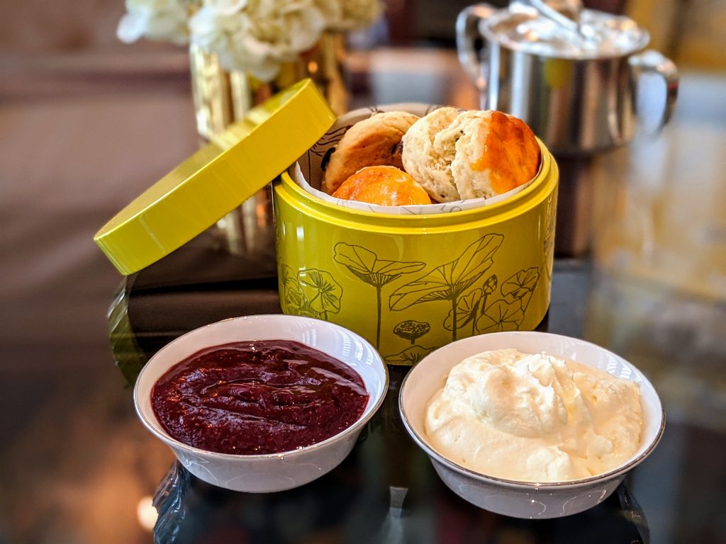 Our first course was the tea with four warm scones served with homemade jelly and Tahitian vanilla cream. Oh, what a delight it was to savor every bite as we relished our tea.