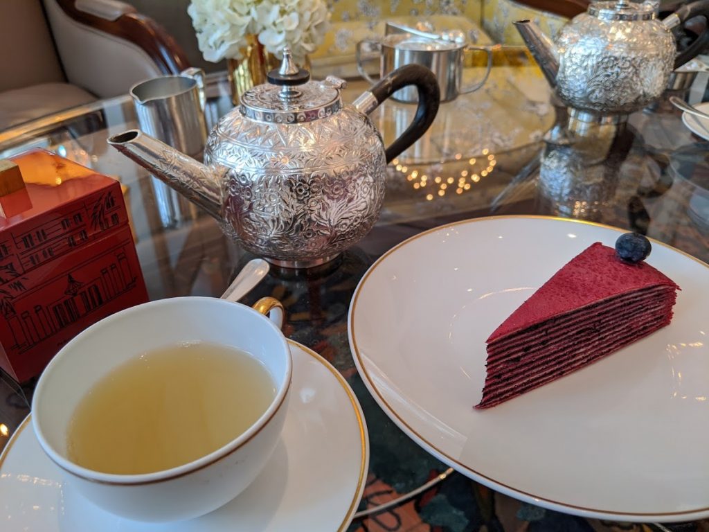 Once they removed the trays and tidied up the table, a fresh pot of tea was brought to the table, with each of us receiving a signature dessert: the blueberry crepe cake and a tin box with chocolate nestled in it. We poured ourselves a fresh cup of tea and started to enjoy the cake. OMG! Philipp and I have never tasted a cake like this before. We were expecting a very sweet dessert, but we were surprised it was just naturally sweetened with the blueberries; it was exquisite. The chocolate completed our experience, after sitting there for two hours enjoying each other and this delicious High tea, it was time to complete this amazing experience. We both highly recommend the high tea at the Park Hyatt Saigon Hotel. I don’t think you will be disappointed.