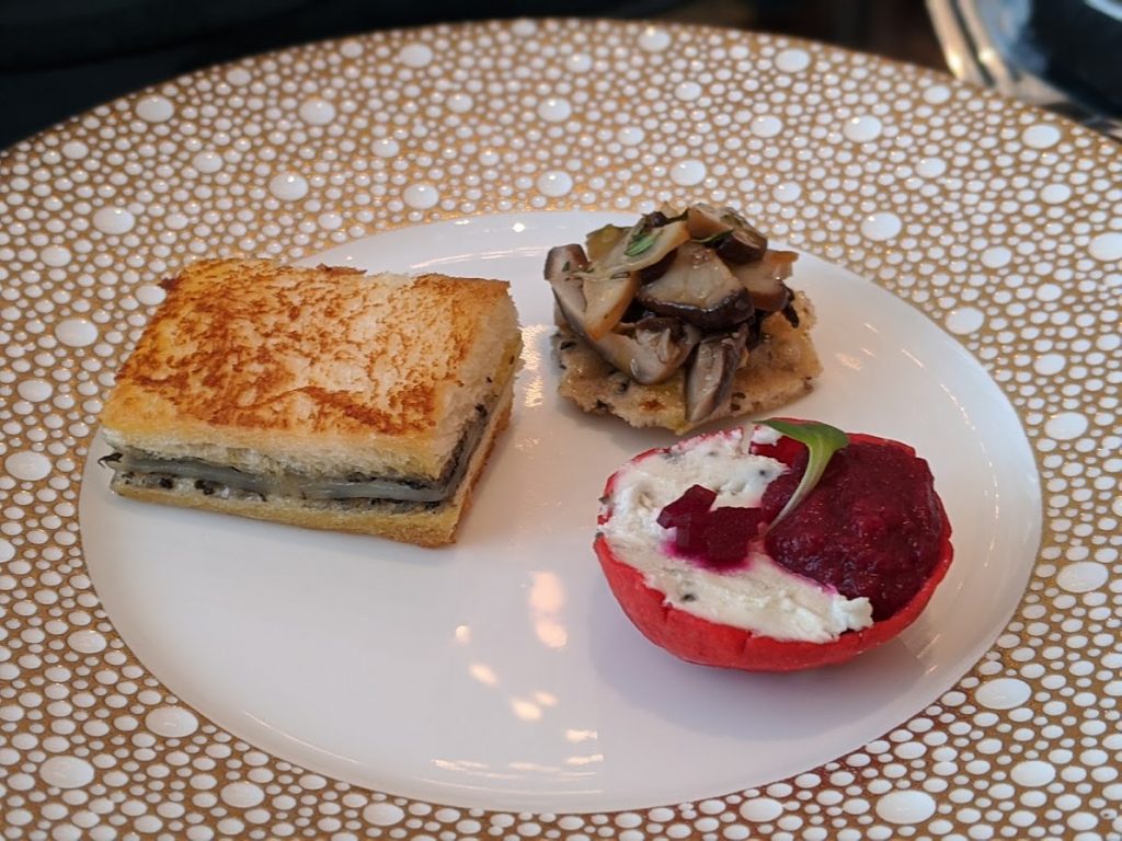 The trays came out with nine stunning bite-sized treats accompanied by chef Guinot to detail each bite. It was special that the chef came to our table to speak to us directly. A lobster brioche bun, Phu Quoc pepper-crusted salmon, garden goi cuon, truffle, and cashew hummus, Iberico pork belly reuben, foie gras terrine, Meridith valley goat cheese. The sweet selections were pomelo ginger profiteroles, strawberry lime slice and orange blueberry macaron. The chef also explained the substitutions he made for the vegetarian tray — what a lovely chef.