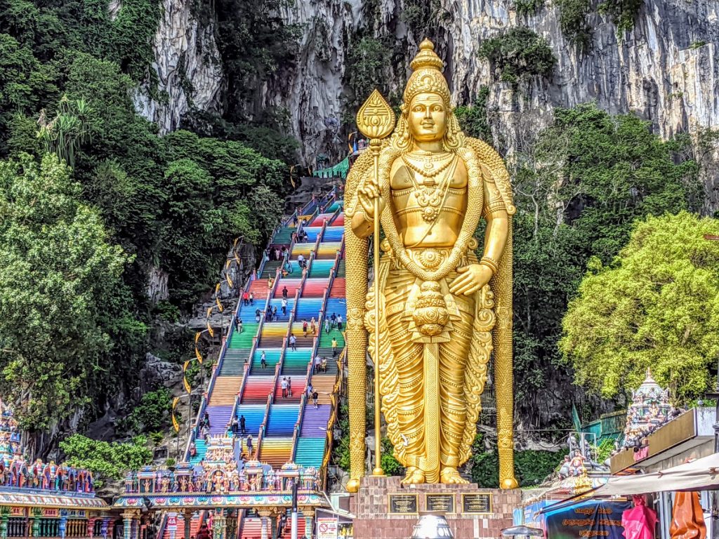 The first thing you notice when you arrive at the caves is the iconic statue of Lord Murugan. This majestic gold statue stands 42.7 meters high. It is the tallest statue in the world of Lord Murugan.