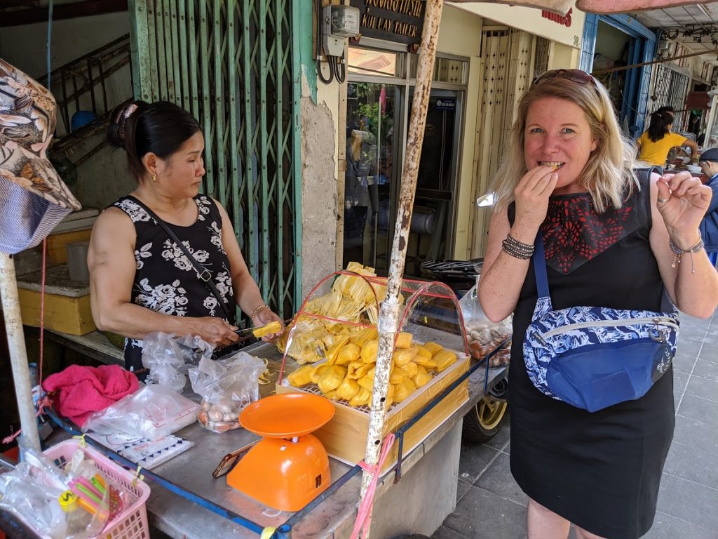 It grows abundantly in southeast India; it is the national fruit of Bangladesh. It grows all over Southeast Asia and you see it sold everywhere in Thailand, Vietnam, and Malaysia. A tree can produce up to three tons of fruit per year. It is the largest tree-borne fruit in the world. A jackfruit can weigh up to 100 pounds and grow up to three feet long. It looks a bit like an oblong honeydew melon with spikes.