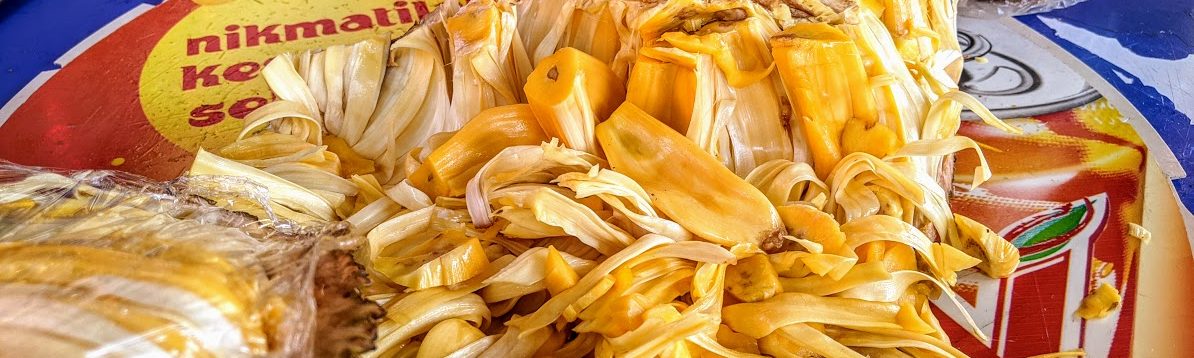 It grows abundantly in southeast India; it is the national fruit of Bangladesh. It grows all over Southeast Asia and you see it sold everywhere in Thailand, Vietnam, and Malaysia. A tree can produce up to three tons of fruit per year. It is the largest tree-borne fruit in the world. A jackfruit can weigh up to 100 pounds and grow up to three feet long. It looks a bit like an oblong honeydew melon with spikes.