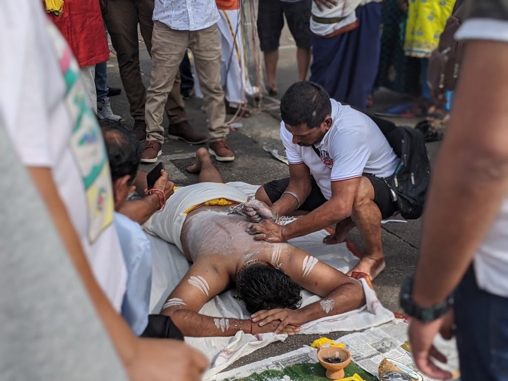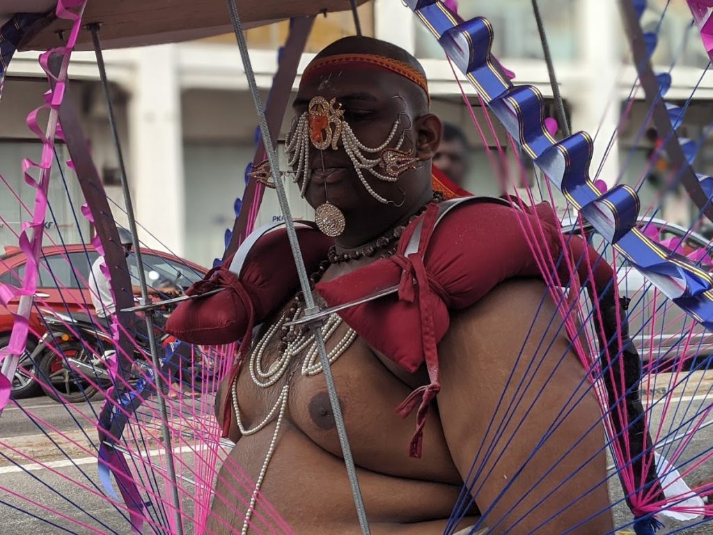 Devotees pierce their cheeks with spears and put hooks through their skin. Once pierced the devotees prepare to carry the Kavadi which is a semicircular, decorated canopy supported by a wooden or metal arch with elaborate decorations, which is placed on the devotee’s shoulder. A Kavadi can weigh as much as 100 kilograms and are typically affixed to a person’s body using sharp metal spikes dug into the skin, they walk barefoot in the hot cement from one temple to the other to show their devotion. It is a ceremonial sacrifice and offering practiced by devotees during the worship of Lord Murugan, the Hindu god of war. This is the central part of the festival of Thaipusam.