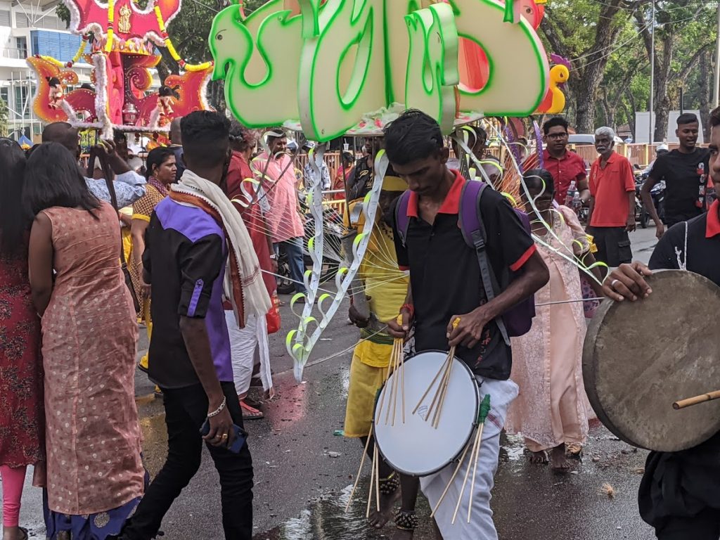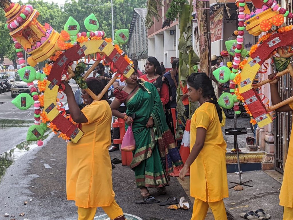 When we got to Maha Shi Mariamman temple at 3:30 people were celebrating with excitement thumping drumbeats, chanting and preparing devotees to carry the Kavadis to the new waterfall temple, Arulmigu Balthandayuthapani Kovil in Penang.